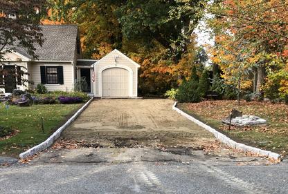 At this home in Chelmsford, we removed the existing driveway, regraded the area, and then installed granite cobble stones along the edges and an apron at the end for a design feature. Once this was completed, it was repaved with a grade to direct water away from the house and garage.